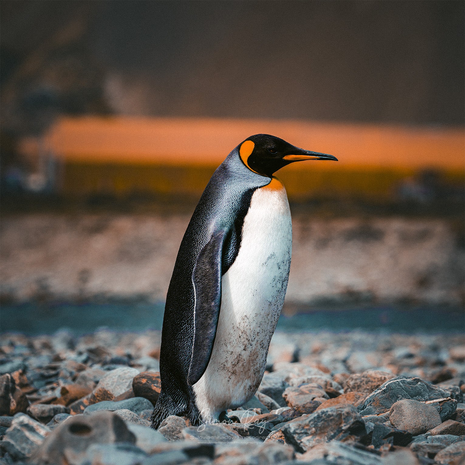 A king penguin at Stromness on South Georgia Island. The orange band in the background is a rusting roof of an old whaling station.