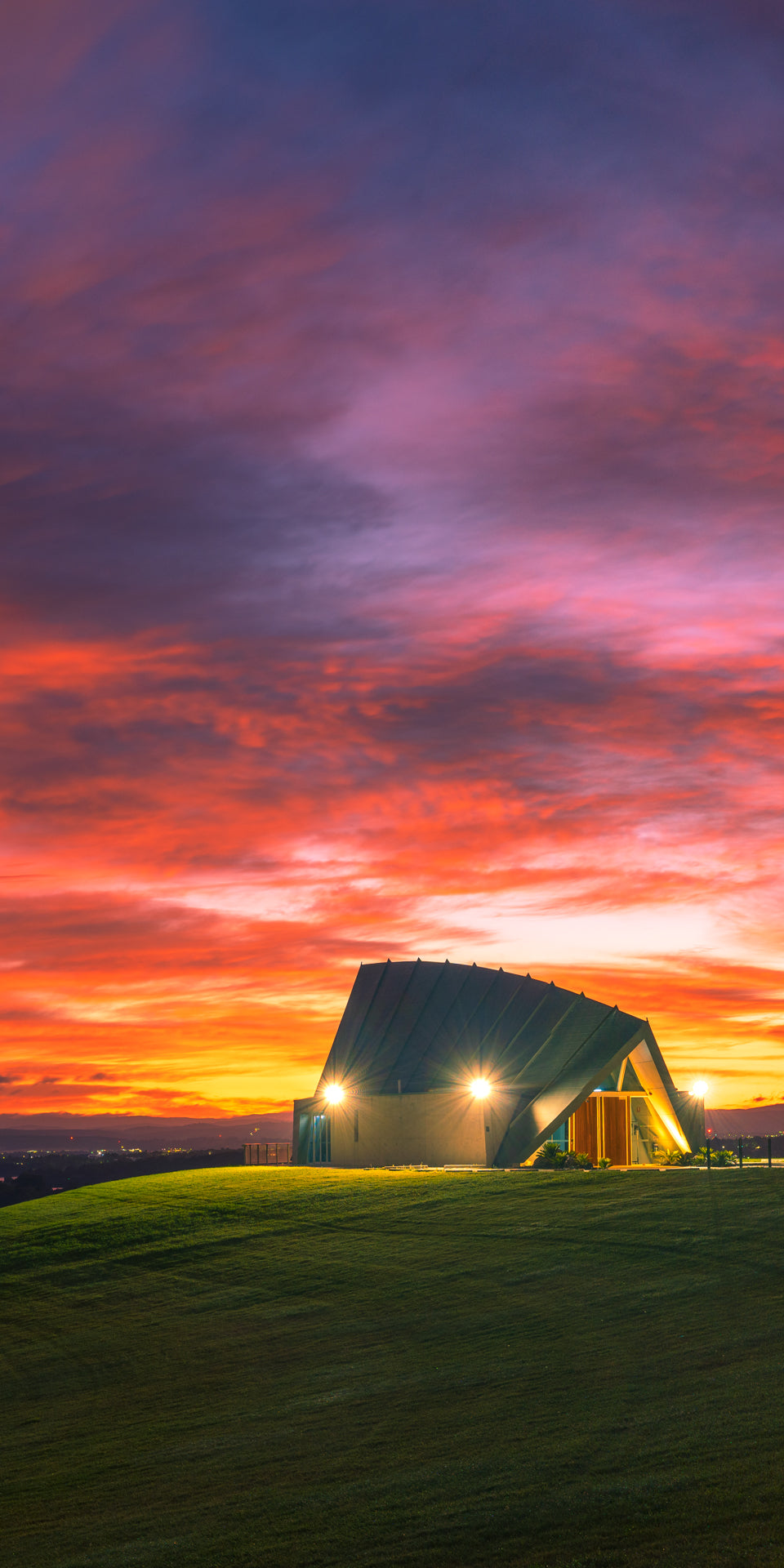 Dawn breaks over the Margaret Whitlam Pavillion in the National Arboretum in Canberra.